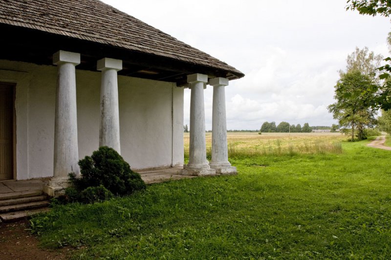 Vienstāva mūra ēka ar četrslīpu jumtu, lieveni galvenajā fasādē, dubultkolonnām.
