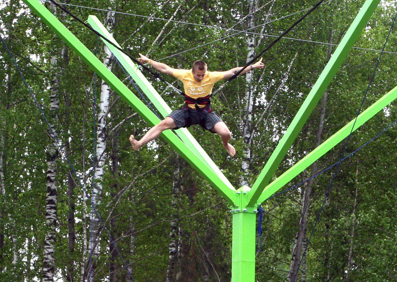 Pateicoties gumijām, kurās ir "iekārts" atrakcijas lietotājs un batutam zem kājām, divkāršo salto un citus akrobātiskus trikus 6m augstumā var izpildīt bez riska. “Sienāzis” paredzēts gan lieliem, gan maziem un vienīgais ierobežojums ir lēkātāja svars, kuram jābūt 24 – 84 kg robežās.
