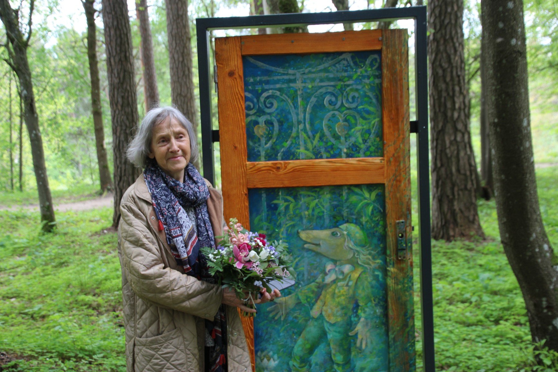 Sajūtu parkā izstādītas Anitas Jansones-Zirnītes apgleznotās durvis, attēlojot Ķūķa tēlu